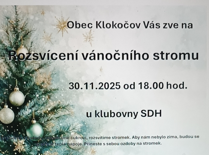 Zazpíváme si koledy, ochutnáme cukroví, rozsvítíme stromek. Aby nám nebylo zima, budou se podávat teplé nápoje. Přineste s sebou ozdoby na stromek.